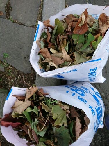 1年通して取った雑草、落ち葉達を いただいた肥料袋に詰めておく 昨日慌てて強剪定した薔薇達や、 大きくなり過ぎて除雪車の妨げになる 木の枝、プランターに植えていて1年間楽しませてくれた花達をトラックに積み込んでいただく 農家さんのご好意で畑で堆肥…