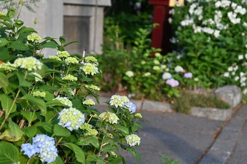 今年はケタ外れの猛暑で 紫陽花が早くも色づき始めました。 いつもはヤーヤドーのころ咲くので 10日ほど早いですね。 歩道側のラベンダーは 今8分咲きくらいです。 東 庭撮影時は5時10分 今日もお日様が早朝からパワフルです。 5時10分 奥 かん太・手前 真…