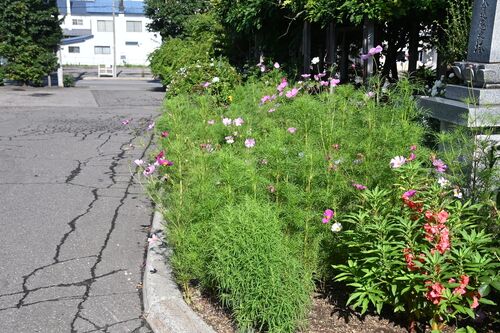 初秋の西庭です。 本格的な秋薔薇シーズンの前に、 コスモスや椿咲きホウセンカが花盛りです。 藤棚の下では ひまわり「ミラクルビーム」と こぼれ種からのコキアがふさふさしています。この西庭はもともとほぼ砂地で トドマツや桜やツツジなどの足元に スギ…